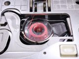 次にケース本体と糸調子板バネの間に入るように糸を引っぱりボビンケースに開いている窓まで持っていきます。