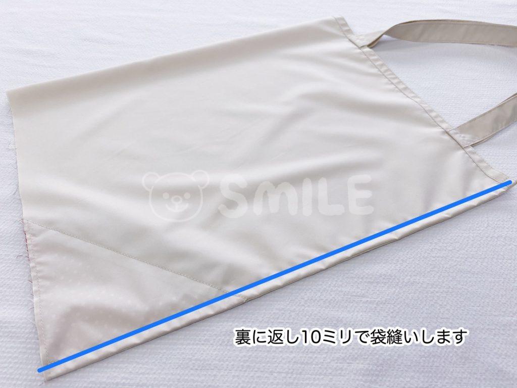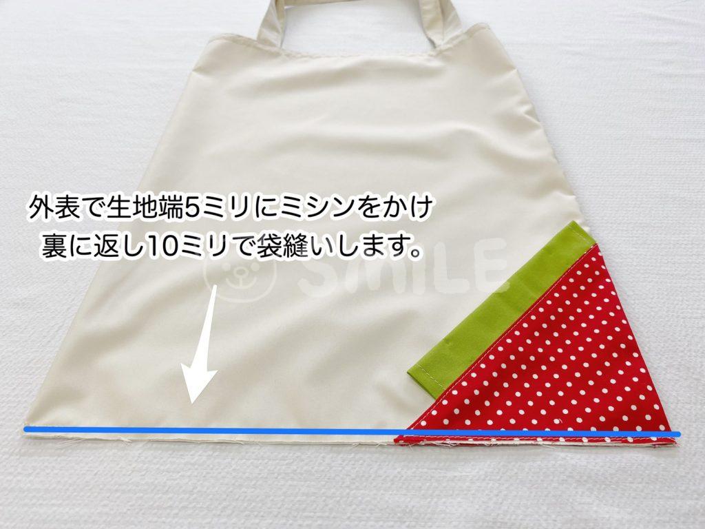 底も同様に外表で生地端5ミリでステッチし、裏に返し10ミリで袋縫いします。
