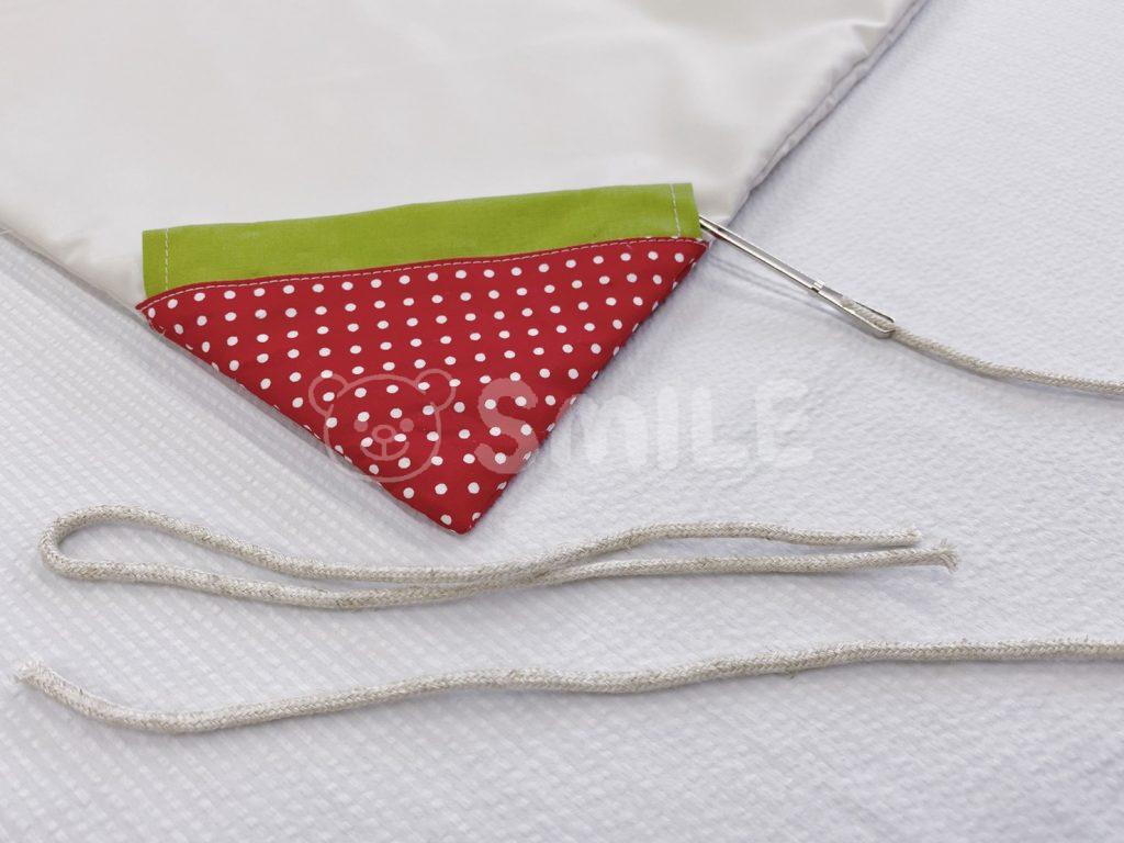三角の赤ドットの斜めラインに、中心を合わせてひも通し布を重ね1センチで縫い合わせ 縫い代を三角布側に倒してアイロンをします。
