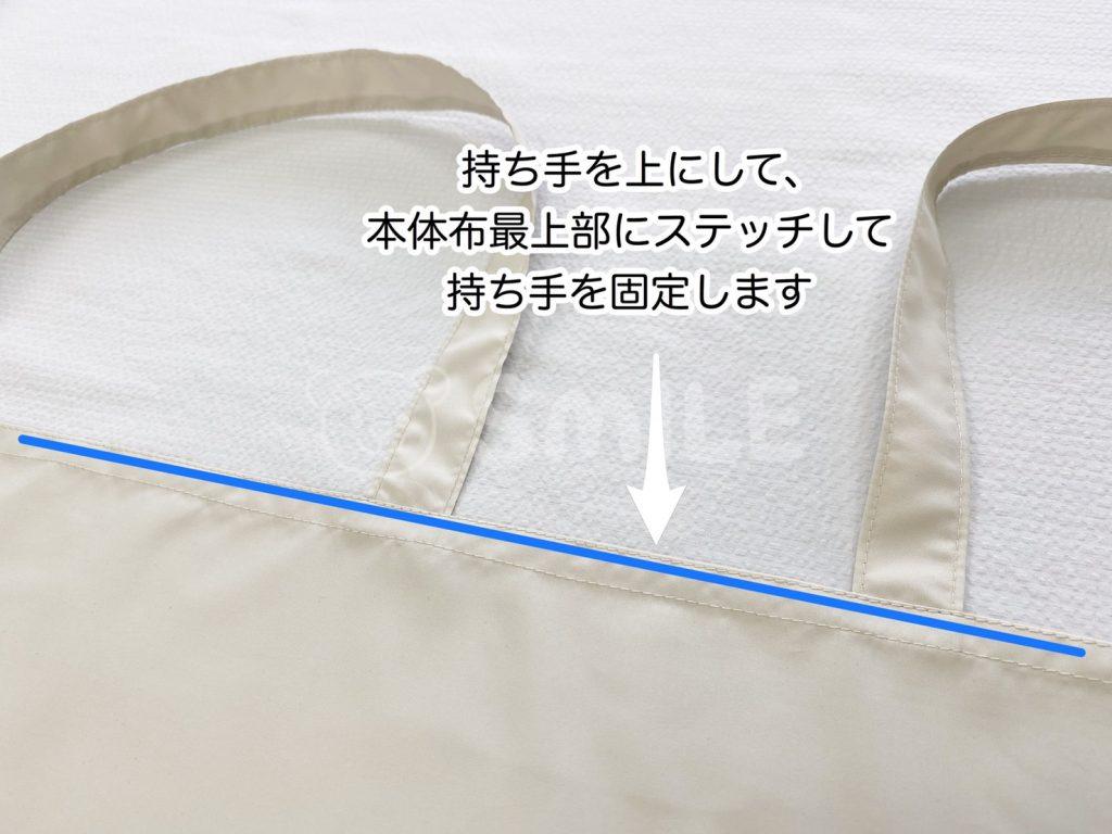 続いて持ち手を上に持ち上げ、本体布最上部をミシンステッチして持ち手を固定します。生地表側から縫います。