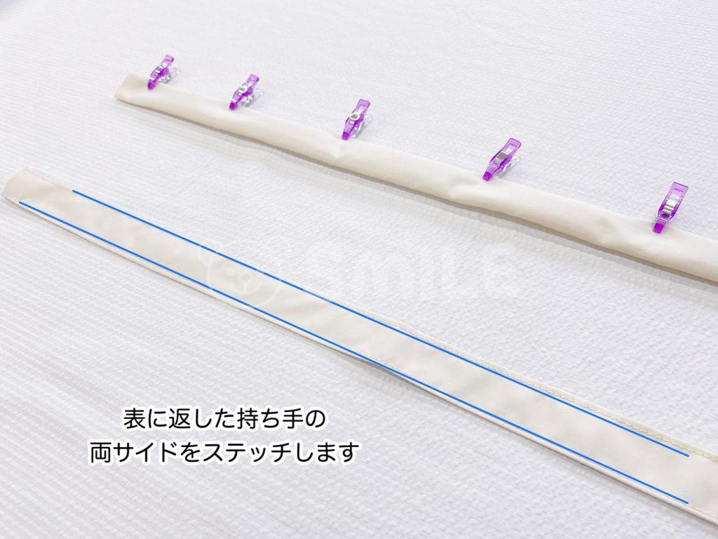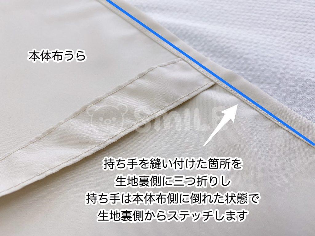 持ち手を縫い付けた箇所を生地裏側に三つ折りし、持ち手は本体布側に倒れた状態でミシンをかけます。※生地裏側から縫います。