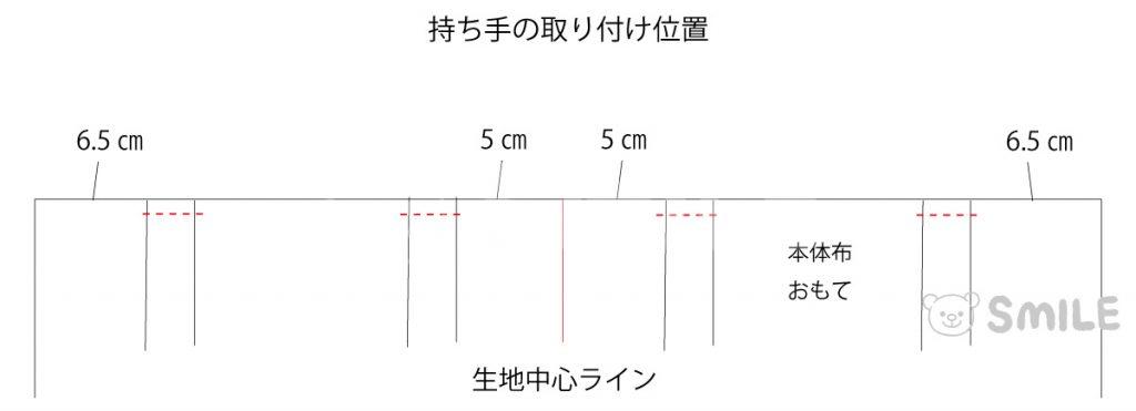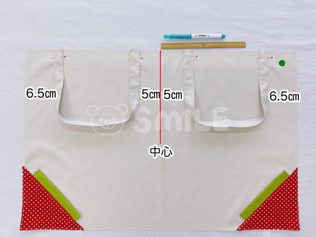 本体布上部、生地端から6.5センチの所と生地中心から左右5センチの所にチャコペンで印を入れます。