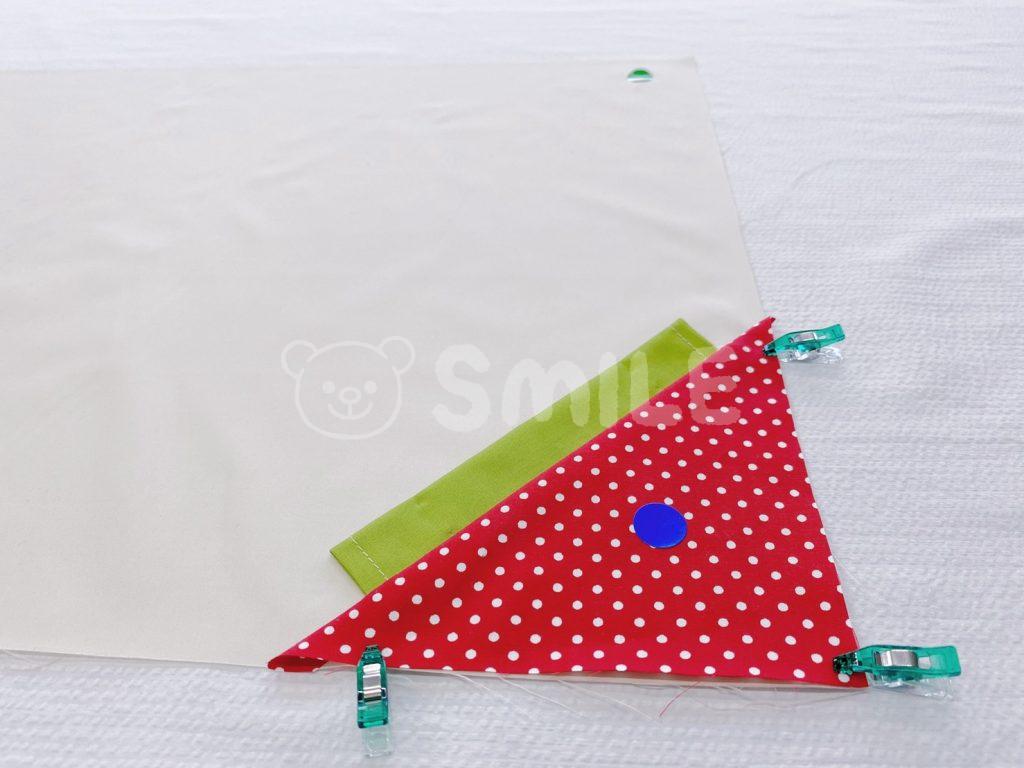 三角布を本体布に合わせて生地端2~3ミリ程の箇所3辺を縫い合わせます。