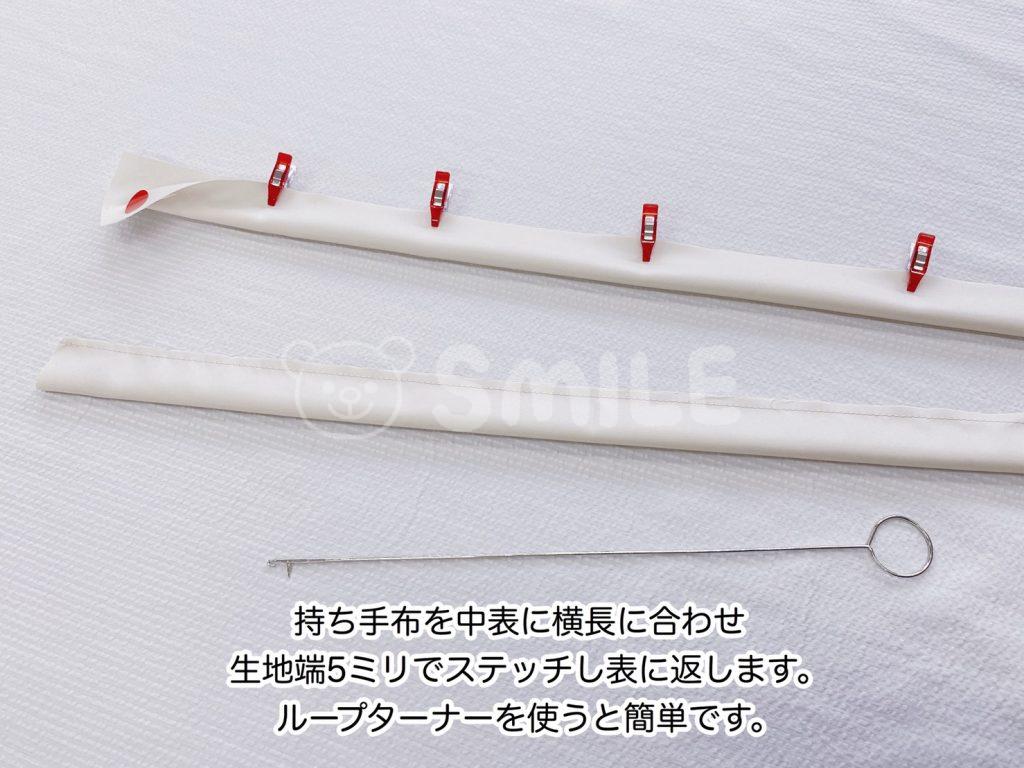持ち手布を中表で横長に合わせ生地端5ミリでミシンステッチする。