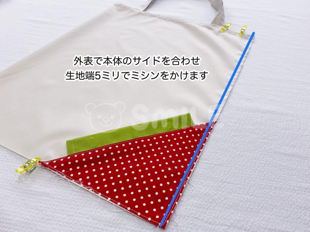 外表で本体サイドを合わせ生地端5ミリでステッチし、裏に返し10ミリで袋縫いします。