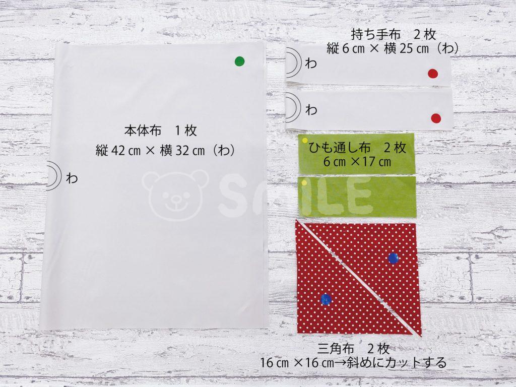 三角布(赤ドット):16センチ×16センチ→斜めにカットして2枚にする