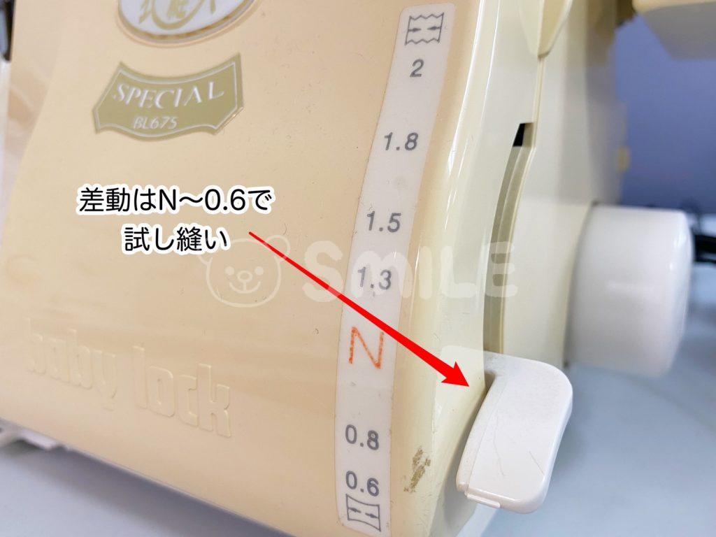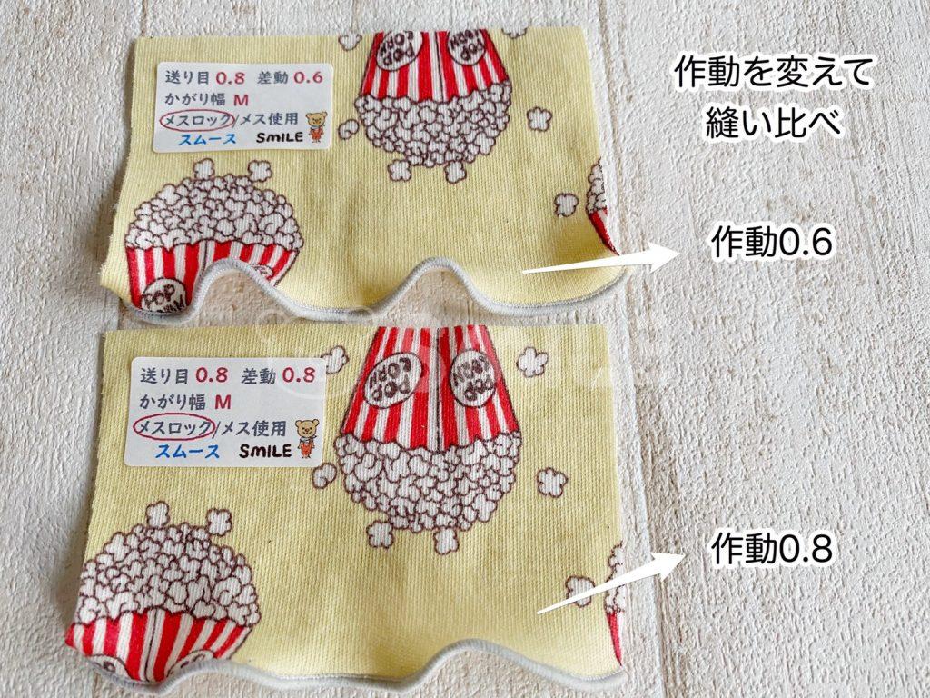差動は生地のテンションですが、ニット生地の巻きロックは綺麗なウエーブになるように縫いたいので、差動を0.6や0.8で縫ってみました。