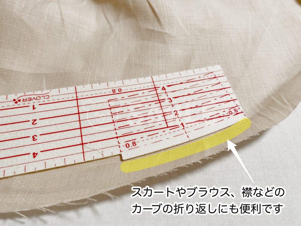 曲線の折り返しに便利なカーブの辺があるので、ブラウスの裾、襟のカーブ、スカートの裾など緩やかにカーブがある箇所にとても便利です。