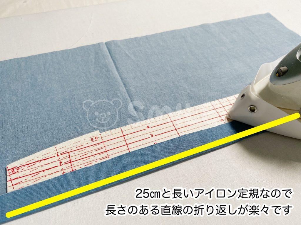 今までの短いタイプのアイロン定規よりも倍近い長さがあるので、直線の折り上げが本当に楽でした。