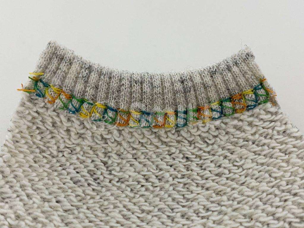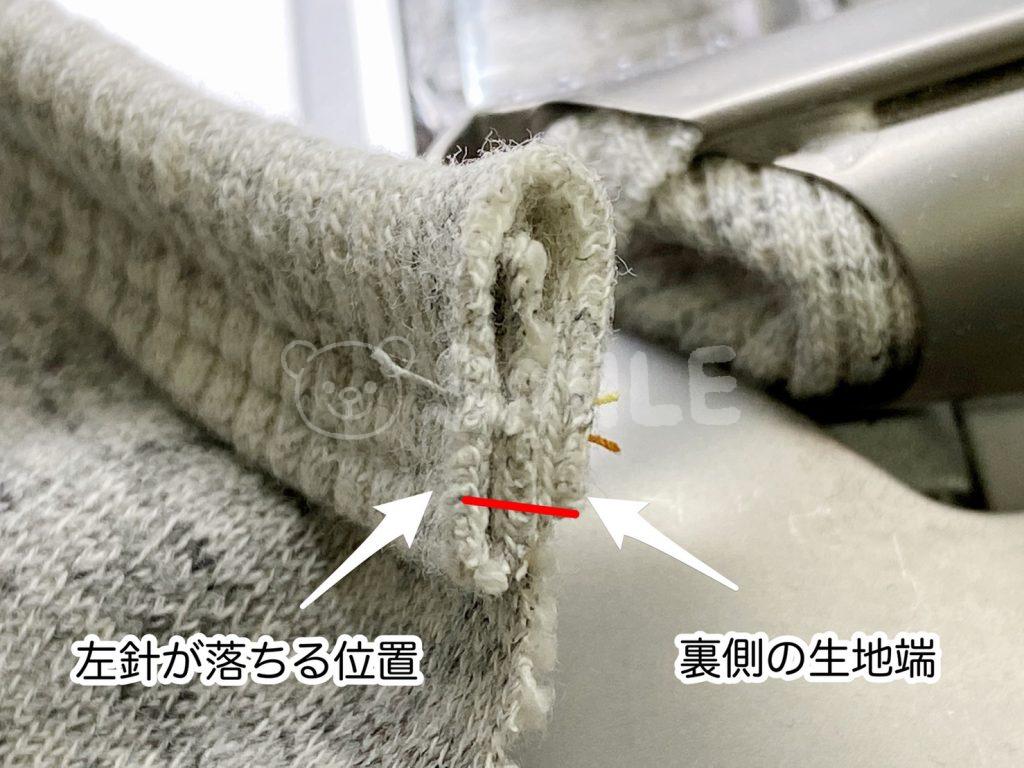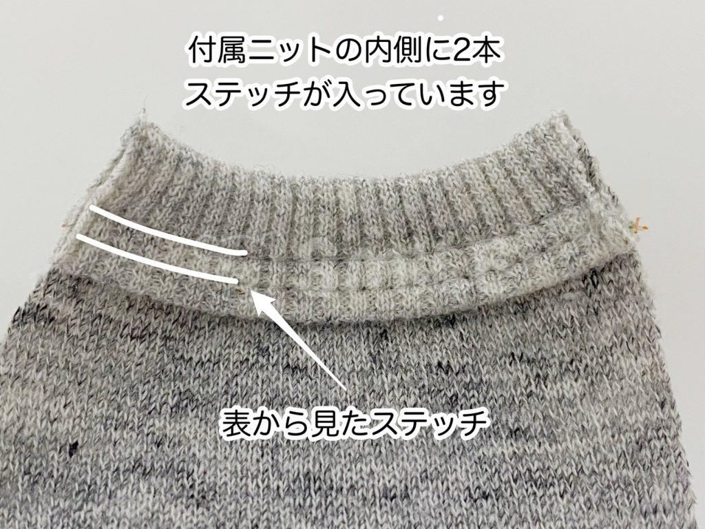 下の画像のように、付属ニットのテープの生地端がルーパー糸のラインにぴったりとあっています。